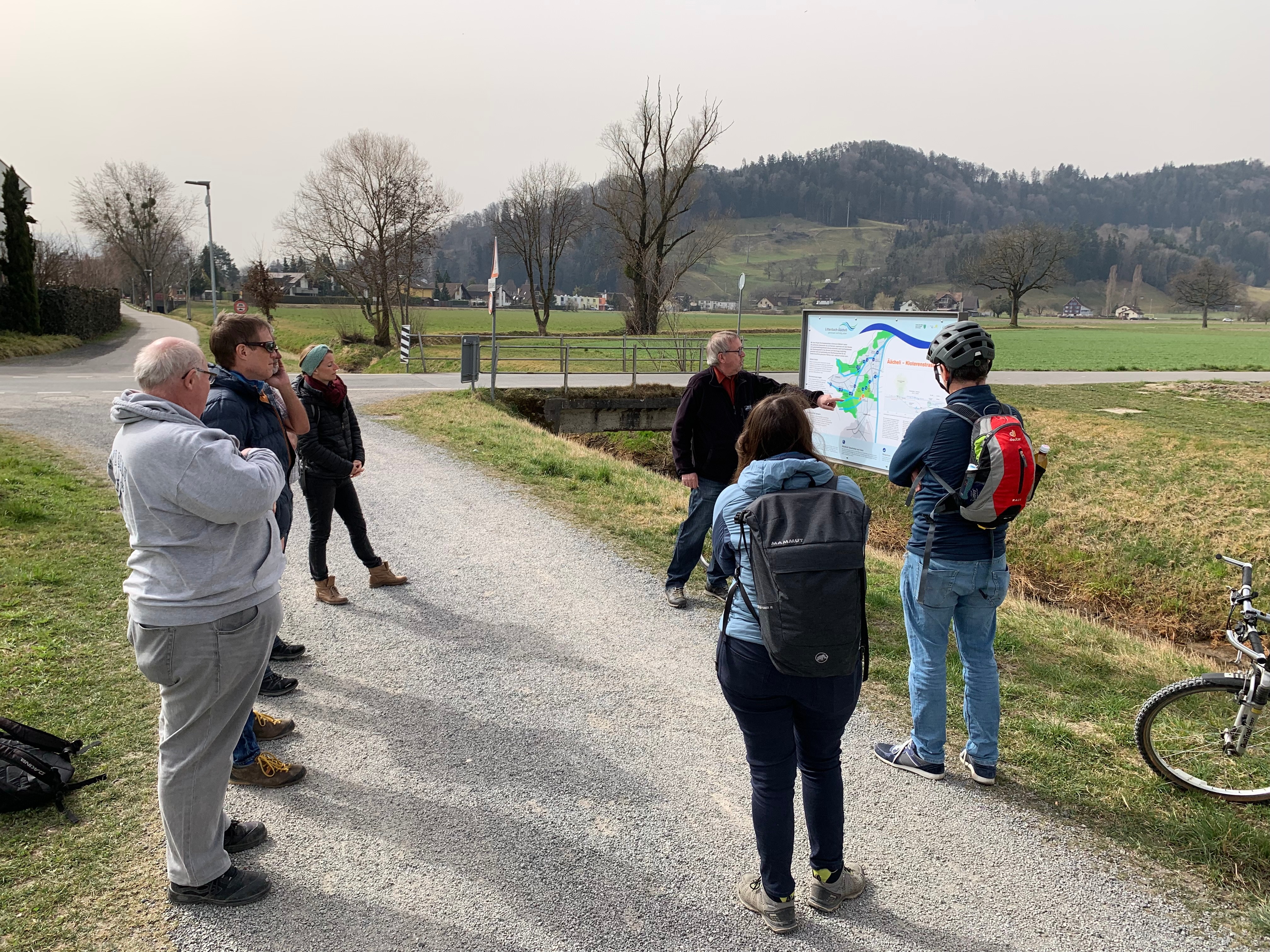 Am 16. März 2022 besuchten nun die Vertreter von Bund und Kanton das Projektgebiet. Mit Velos erkundeten sie unter Leitung von Bauherrenvertreter Reto Walser die Bachläufe und liessen sich die vorgesehenen Massnahmen und Herausforderungen vor Ort von den Fachplanern erklären.